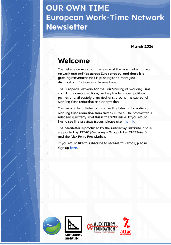 The Network’s main objective is to create a permanent and open forum between organisations and actors working on a reduction in working time. This quarterly newsletter collates and shares the latest information on working time reduction from across Europe.